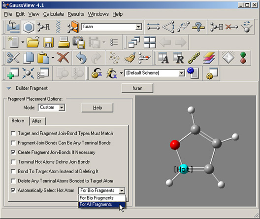 - Automatically Select Hot Atom:この項目は「biological fragments」での使用を目的に作られたものです(デフォルト設定)。この設定によりGaussViewでは「hot atom」が動的に決められます。残基を追加するのにふさわしい主鎖の生成により、アミノ酸残基などを作成することが容易になります。