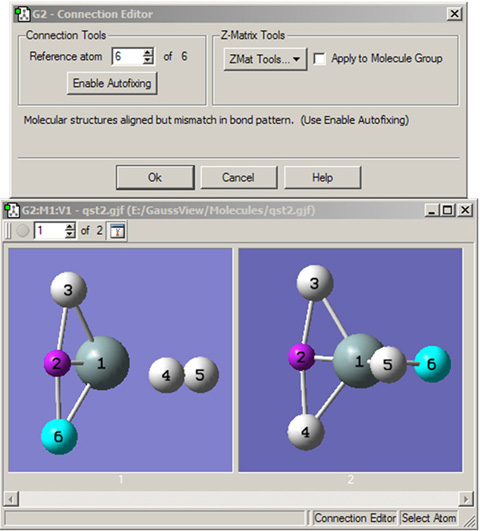 結合エディターは、2つの分子構造で等価な原子を確認や設定することに用います。分子グループを操作するときは、マルチ構造表示モードで見ることにより比較や編集が簡単になります。この不自然な例では、原子を適切な対応関係にするためには片方のモデルの原子4と6の順序を交換する必要があります。この変更は、「Enable Autofixing」ボタンをクリックして行うか、あるいは手動で行うことが出来ます。