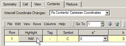 このパネルで原子を追加するには、原子リストエディターと同様の手順を用います。テーブルの最後の行(テーブルが空の場合は1行目)にAddボタンがあります。このボタンをアクティブにするためには、Symbol欄に元素タイプを入力します。新しく追加する原子に対して、残りの欄を使って分率座標を指定することも出来ます。追加の原子は、空間群の制限に一致させるためAddボタンをクリックしてはじめて追加されます。
