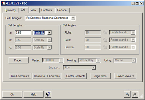 - Trim Contents:指定した方法を用いてセルの構成原子を変更します。「Delete All Atoms Outside Cell」が選択されている場合、セル境界の外にある全ての原子は削除されます。「Translate All Atoms Inside Cell」が選択されている場合、セル境界の外にある全ての原子はセル境界内の等価な位置に移されます。余分な原子は削除されます。