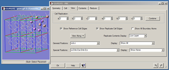 このパネルでは、ビューウィンドウ内にいくつのセルを表示させるかを指定します。このビューウィンドウには、ヒ化ガリウムの3次元構造を示しています。各方向に2つのセルを表示しています。複製セルの構成原子は、Lowレイヤー表示形式(複製セルのデフォルトの表示モード)を用いて表示されています。