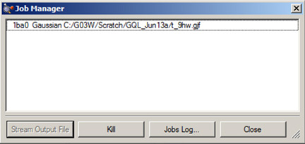 このウィンドウには、GaussViewから開始されて計算中のものが表示されます。現在動作しているGaussViewから開始されたものだけが表示される事に注意してください。表示されるジョブは、Gaussianダイアログボックスから投入されたGaussianジョブ、GaussViewから開始された外部エディターによる入力ファイル編集セッション、表示用の面を構築するためのcubegenプロセスなど他のGaussianユーティリティのプロセスです。