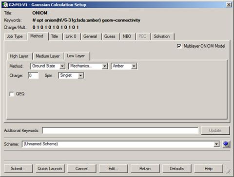 この例では、2層のONIOM計算の入力ファイルを作成しています。「Multilayer ONIOM Model」にチェックを入れると、「Method」パネルに追加のタブが現れます。それぞれのタブで、各層で使用する理論手法と基底系を設定します。この場合、低層ではAmber分子力場を使用しています。