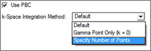 The 「Use PBC」ボックスをチェックすると、分子定義に並進ベクトルが追加されます。図のようにオプションを選択すると、K-点の数を設定するための欄が追加で表示されます。