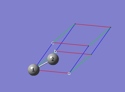 6-3 「PBC」ダイアログの「Cell」タブで、「b (0,1,0)」を選択します。これにより、マウスを使用してセルの「b」格子ベクトルの先端を分子ビューウィンドウで指定できます。分子ビューウィンドウで、3番原子をクリックします。
