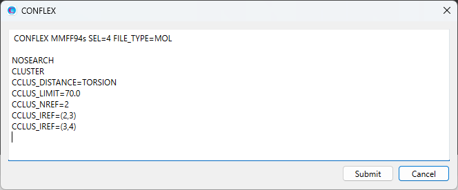 MMFF94S CONFLEX SEL=4.0 CHECK=(TORSION,NOENERGY) NOSEARCH CLUSTER CCLUS_DISTANCE=TORSION CCLUS_LIMIT=70.0 CCLUS_NREF=2 CCLUS_IREF=(2,3) CCLUS_IREF=(3,4)