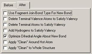このパネルのオプションでは、ある分子構造にフラグメントを追加した後に自動的に実行される動作を選択することが出来ます。この例の設定がデフォルトです。