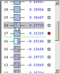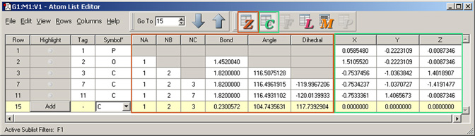 あらゆる分子構造パラメーターは、このスプレッドシート様のウィンドウで編集することが出来ます。左端の列のRowセルをクリックすることで、原子を選択できます。「Highlight」列のドットをクリックすると、対応する原子を分子のビューウィンドウで選択/非選択状態にできます。
