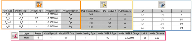 左上から時計回りに、「Molecular Mechanics Parameters」ボタン、「PDB Info」ボタン、「Fractional Coordinates」ボタン、そして「ONIOM Layers」ボタンによりそれぞれ制御されます。影付きの列は読み込み専用です。
