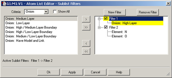 この機能を使うためには、まずNew Filterボタンを用いてフィルターを作成する必要があります。フィルターは常にFilter nと名付けられ、変更することは出来ません。フィルターは、Criteriaリストにある項目を用いて設定します;ポップアップメニューに、利用可能な基準項目のカテゴリーが表示されます。図では、Filter 1を設定するためにOniomカテゴリーを用いています。リストから一つ以上の基準を選択し、そしてそれらを「 >」ボタンを用いて選択されているフィルターに移動します。ここでは例として示しませんが、異なるCriteriaカテゴリーに属する項目を同じフィルターで組み合わせることが可能です。