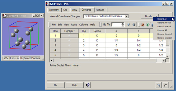 このパネルには、単位格子を構成する原子のリストが表示されています。ここには原子間を適切に再結合させることが出来るBondsボタンも含まれていて、主にCellパネル(図37)でパラメーターを修正した後に用います。