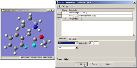 最適化の出力に距離が記録されるように、2つの選択した原子の結合座標を追加しています(原子間で実際に結合してはいません)。ウィンドウ内のリストには、すでに追加してある他の2つの座標が表示されています。