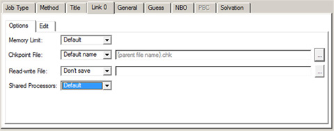 このパネルでは、checkpointファイル名と計算で使用するメモリー量を設定します。サブパネルの「Options」では、様々な設定を行えます。代わりに「Edit」パネルを使用して、直接Link 0コマンドを編集することもできます。