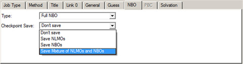 パネルでは、NBO解析の種類の指定とcheckpointファイルに保存するNBOの指定を行います。このウィンドウで選択する事により、データをCASSCF計算での活性空間の作成に使用できます。