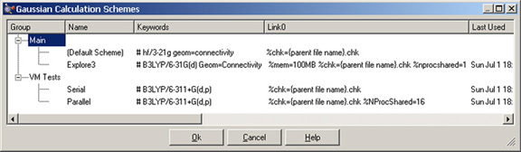 スキーム内のどの項目も、クリックすれば編集できます。マウスの右ボタンをクリックするとコンテキストメニューが表示され、グループやスキームを追加や削除、項目間のカット&ペーストが行えます。また、スキームを外部ファイルに保存し、後でGaussViewに再び読み込むこともできます。なお、「Default」スキームと「Main」グループは名称変更や削除はできません。