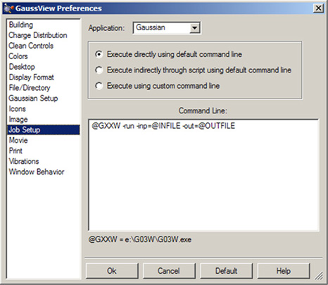「Preferences」ダイアログの「Job Setup」では、3番目の選択肢として外部プログラム用に独自コマンドを設定できます。この機能を上手に使うには、Gaussianとそのユーティリティを各オペレーティングシステムで使う上での実行コマンドをきちんと理解しておく必要があります。詳しくは、Gaussian 03 User’s Referenceをお読みください。