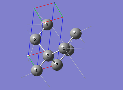 6-2 「PBC」ダイアログの「Cell」タブで、「Place」ボタンを押してから「a (1,0,0)」を選択します。これにより、マウスを使用してセルの「a」格子ベクトルの先端を分子ビューウィンドウで指定できます。分子ビューウィンドウで、7番原子をクリックします。