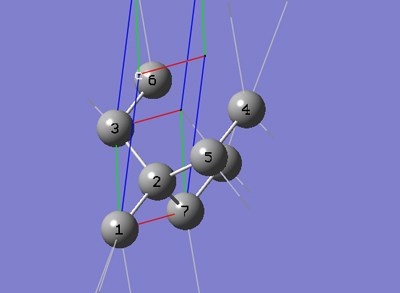 6-4 「PBC」ダイアログの「Cell」タブで、「c (0,0,1)」を選択します。これにより、マウスを使用してセルの「c」格子ベクトルの先端を分子ビューウィンドウで指定できます。分子ビューウィンドウで、5番原子をクリックします。