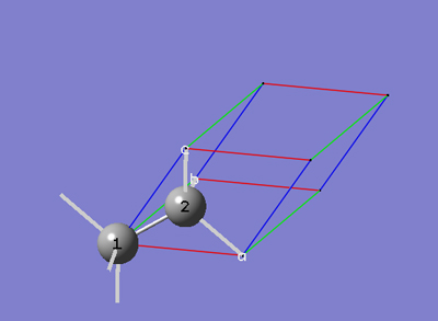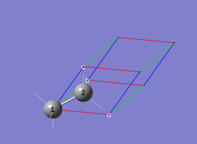 6-3 「PBC」ダイアログの「Cell」タブで、「b (0,1,0)」を選択します。これにより、マウスを使用してセルの「b」格子ベクトルの先端を分子ビューウィンドウで指定できます。分子ビューウィンドウで、3番原子をクリックします。